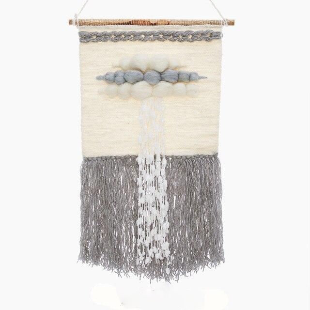 Denne veggryen er designet for å bringe en følelse av ro og hygge inn i ethvert rom. De håndlagede skyene, med sine ulike nyanser av hvitt og lysegrått, gir en fantastisk 3D-effekt som gjør at skyene nesten "popper" ut fra veggen. Under skyene faller det ned "regndråper" i form av hvite, flettede tråder, som ender i en bred frynsekant i en varm gråtone. Dette skaper en harmonisk balanse mellom de øvre og nedre delene av veggryen. De naturlige fargene og materialene gjør den enkel å integrere i ulike interiørstiler, fra det minimalistiske til det bohemske.
